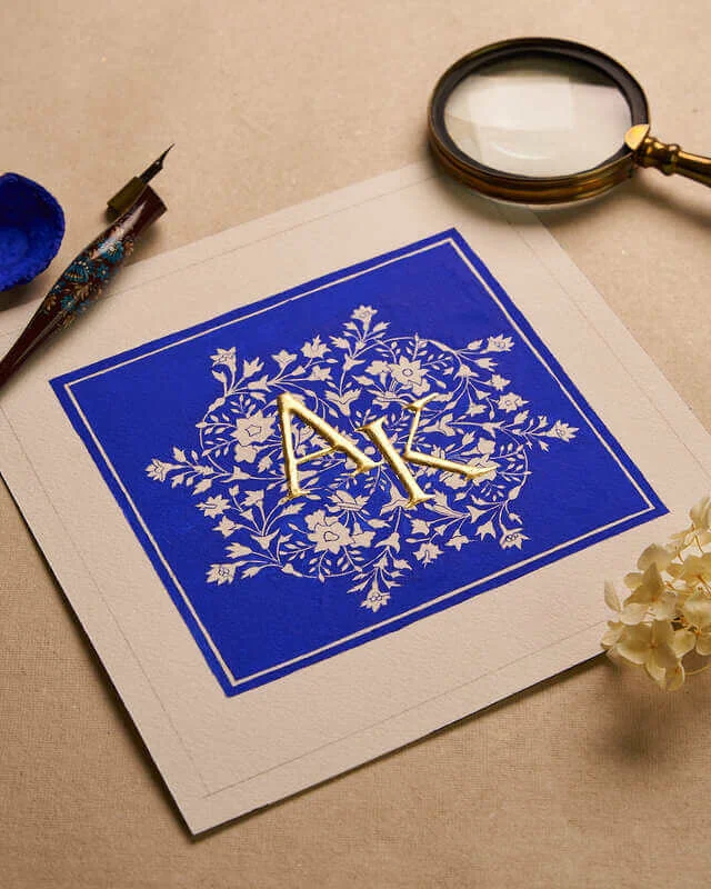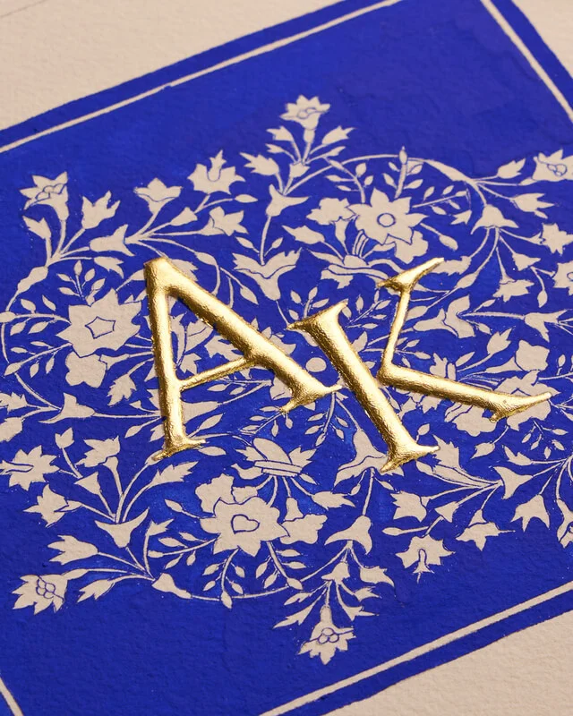 An enthusiastic business owner wanted a monogram that radiated her brand’s vibrant spirit. We chose a beautiful bright blue, paired with a Blue and Gold theme—one of my favourite combos! The gilded initials ‘AK’ are enhanced with intricate lapis lazuli filigree. The deep blue adds celestial depth and luxury, making this dazzling display the perfect statement piece for any monogram lover.