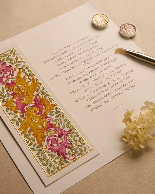 • Materials: 23K Gold with gouache and pointed-pen uncial calligraphy using walnut ink on 300 GSM cold-pressed paper