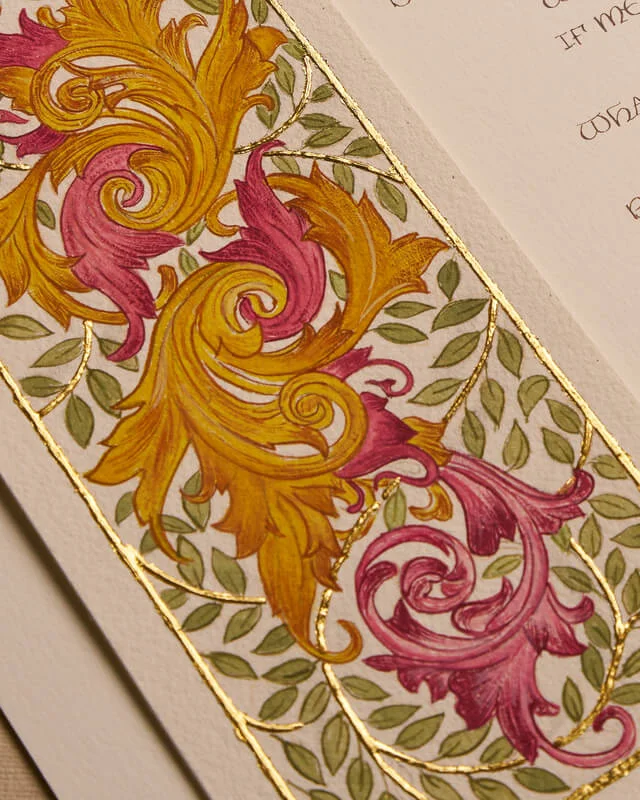 Verses whispered in gold. A soulful Rumi poem intertwines with a mesmerizing band of acanthus leaves, rendered in vibrant gouache and embellished with 24k gold.